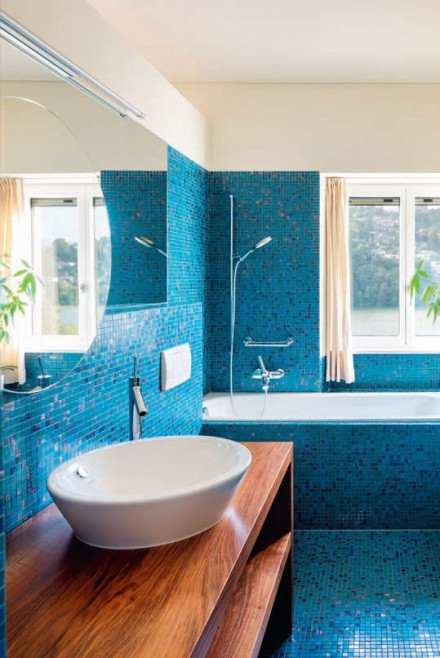 Płytki ceramiczne w odcieniach niebieskich mają swoją długą tradycję. To dominujący kolor zdobień portugalskich azulejos. Jedna z teorii pochodzenia nazwy płytek przyjmuje, że azulejos wzięło się z języka hiszpańskiego i portugalskiego, a dokładniej ze słowa azul, które oznacza właśnie kolor niebieski. To m.in. inspiracja modnych dzisiaj płytek patchworkowych, produkowanych przy użyciu nowoczesnych technologii oraz wykorzystywanych do jak najbardziej współczesnych aranżacji zarówno ścian, jak i podłóg. Wzornictwo włoskie czy hiszpańskie było również bodźcem do stworzenia płytek z majoliki i ceramicznych kafli piecowych manufaktury w holenderskim mieście Delft, a polski rynek zapełniało rękodzieło z Nieborowa. „Błękitny delft” to także reaktywowane dzisiaj wzory płytek. W różnych odcieniach niebieskich spotkamy tradycyjne mozaiki, nowoczesne płytki heksagonalne oraz klasyczne cegiełki typu Metro. Drobne płytki mozaikowe szklane, ceramiczne lub kamienne pozwalają stworzyć bardzo ciekawe kompozycje zarówno w jednym odcieniu błękitu, jak i w ramach różnych tonów tej barwy. Niebieska mozaika w wielu odcieniach zastosowana na dużych powierzchniach daje bardzo dekoracyjny efekt, imitujący wygląd mieniącej się tafli wody.