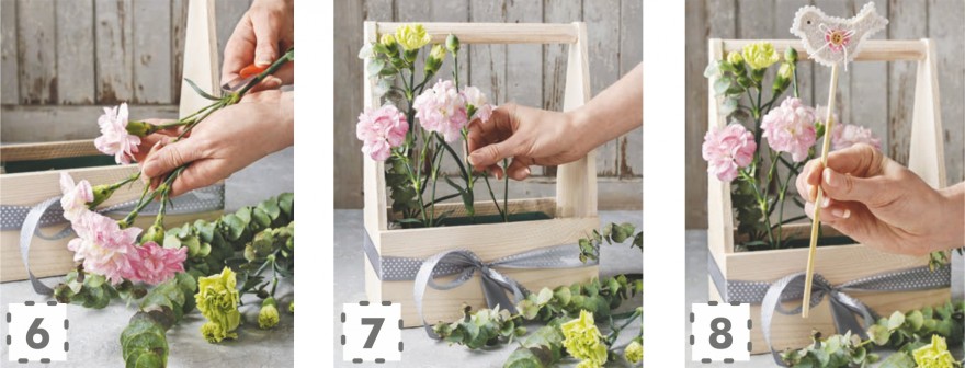 Do naczynia nalewamy zimną wodę i wkładamy do nasączenia gąbkę florystyczną. W tym czasie przygotowujemy skrzynkę, dekorując jej obwód wstążką i wyściełając folią.