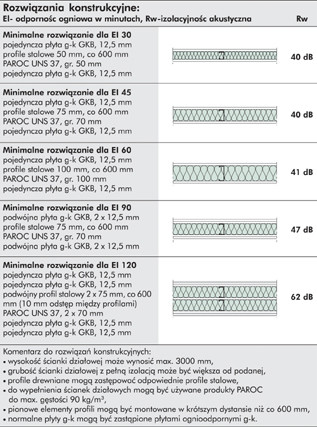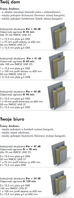 Do izolacji akustycznej ścian działowych znakomicie nadaje się nowa płyta z wełny kamiennej PAROC UNS 37. Oprócz bardzo dobrych właściwości termoizolacyjnych płyta PAROC UNS 37 ma wysoką zdolność pochłaniania dźwięków, co pozwala na jej wykorzystanie jako izolacji akustycznej w różnego rodzaju konstrukcjach ścian działowych. Stosując płytę PAROC UNS 37 spełnione są nie tylko wymagania izolacyjności akustycznej ścian działowych, ale również wymagania odporności ogniowej tych przegród.