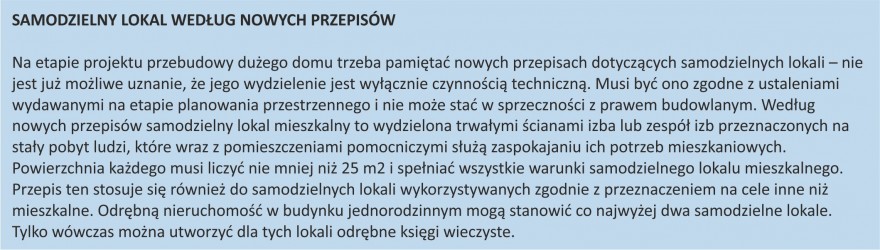 Praktyka budowy czy remontów budynków obchodząca te przepisy była jeszcze do niedawna powszechna – na etapie uzyskania pozwolenia inwestor występował z projektem domu jednorodzinnego, a po jej zakończeniu zlecał przygotowanie inwentaryzacji i występował do starostwa o wydanie zaświadczenia o samodzielności lokali, przedkładając rzuty z zaznaczonymi lokalami. Warunkiem wydania zaświadczenia było ustalenie, czy zgodnie z inwentaryzacją może być uznany za samodzielny w rozumieniu ustawy o własności lokali. Posiadanie zaświadczenia o samodzielności umożliwiało notarialne ustanowienie odrębnej własności mieszkań i ich sprzedaż w domu jednorodzinnym po przebytej metamorfozie. Aktualnie wydanie zaświadczenia o samodzielności lokali będzie wymagało przedstawienia przez inwestora pozwolenia na budowę.