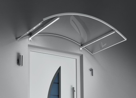 Zdj. 1. Najbardziej popularne zadaszenia drzwi wejściowych wykonane z profili aluminiowych, malowanych proszkowo w wielu wzorach i kolorach. Źródło: Archiwum GUTTA.