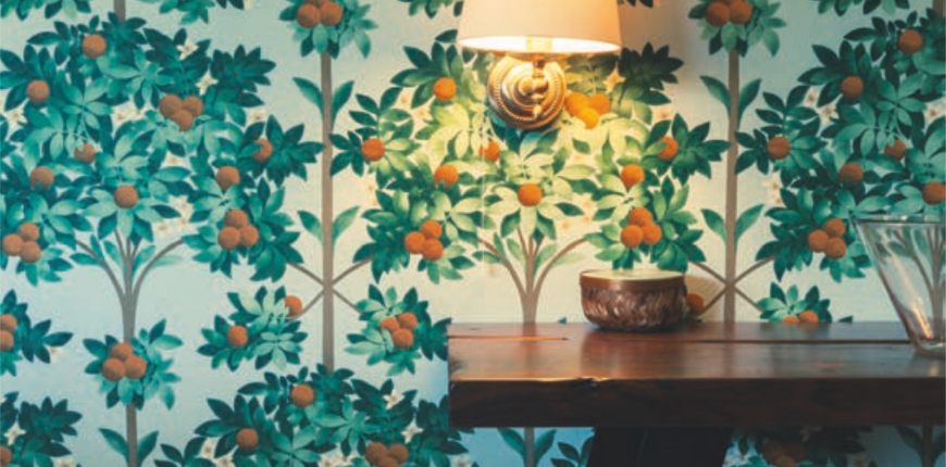Kontrastującym, a zarazem kolorystycznie wzbogacającym wnętrze elementem jest drewniana konsola ustawiona na tle ściany wykończonej tapetą z klimatycznym wzorem sadu mandarynkowego. Intensywnie pomarańczowy kolor owoców nie jest tu jednak jedynym akcentem z tej palety barw – współgrają z nim stylowe lampki z oprawami w kształcie falbanek zawieszone nad wyspą. Jak dwa słoneczka nad turkusowym oceanem!