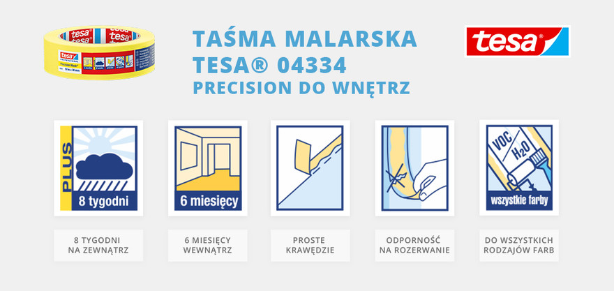Taśma 04334 (żółta) gwarantuje uzyskanie wyjątkowo ostrych krawędzi malarskich. Dzięki idealnej kombinacji specjalnego nośnika i doskonale zbalansowanej masy klejącej, jest niezwykle łatwa w użyciu. Doskonale nadaje się do maskowania dwutonowego, np. do uzyskania prostych i długich linii. Taśma jest również zalecana do maskowania podczas malowania natryskowego.