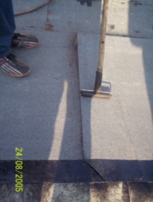 Aby uniknąć zgrubień na zakładach zaleca się przycięcie pod kątem 450 narożnika papy po spodniej stronie zakładu) oraz podgrzać zakład palnikiem na szerokość do 15 cm, wcisnąć posypkę szpachelką (zdj. nr 5)