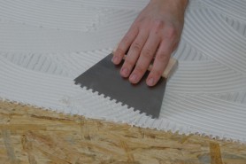 Stosowanie OSB oraz innych płyt drewnopochodnych na podłogach, ze względu na dużą odkształcalność, dyskwalifikuje wykorzystanie klejów na bazie cementu, tu mogą być stosowane tylko kleje dyspersyjne np.: KLEJ DYSPERSYJNY 111. Wykluczenie klejów cementowych, nawet elastycznych jest spowodowane tym, że na płytach podłogowych mogą pojawiać się ugięcia, od których naprężenia w kleju będą zbyt duże, aby mógł je przenieść. Pod ich wpływem następuje odspojenie kleju od płyty wraz z płytkami. Poza tym przyczepność klejów cementowych do płyt OSB i wiórowych jest niewielka, nawet po odpowiednim przygotowaniu płyty. Klej dyspersyjny 111 produkowany jest na bazie żywicy syntetycznej z wypełniaczami mineralnymi oraz domieszkami, poprawiającymi właściwości użytkowe. Posiada on bardzo wysoką przyczepność do wszelkich materiałów tradycyjnych (tynki cementowo-wapienne, gipsowe, jastrychy) jak i trudnych (oprócz płyt drewnopochodnych to stare okładziny ceramiczne, lamperie z farb olejnych, ogrzewanie podłogowe itp.). Jest wysoce elastyczny przez co nie pęka pod wpływem odkształceń. Klasa i typ kleju wg normu PN-EN 12004 to D2E, a więc klej o podwyższonych parametrach przyczepności! Warto podkreślić, że jest to klej biały, a więc nie powoduje przebarwień kamienia naturalnego. KLEJ DYSPERSYJNY 111 dostępny jest w opakowaniach 7 i 15kg, a więc można go także wykorzystać do niewielkich uzupełnień w okładzinie ceramicznej (nie trzeba kupować ciężkich opakowań 25kg), a praca nim nie wymaga dużych nakładów sił (nie trzeba mieszać z wodą, nie trzeba posiadać wiertarki, wystarczy kielnia).