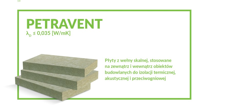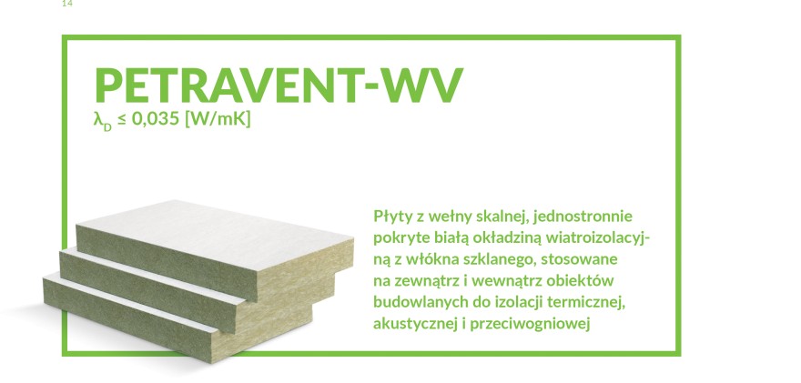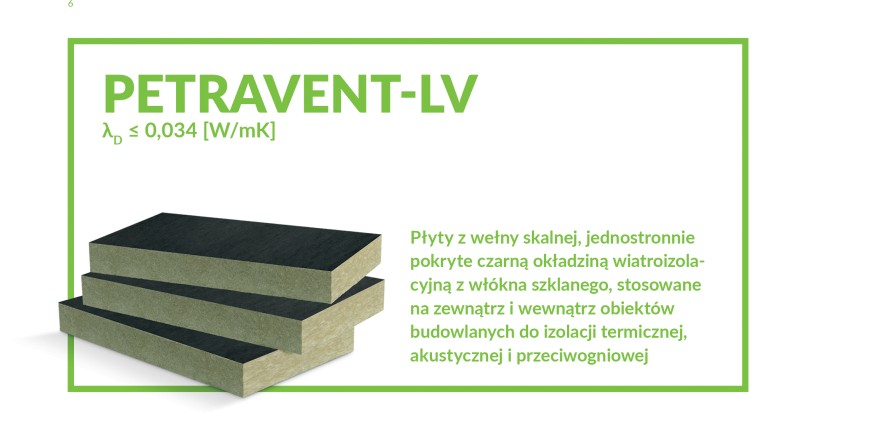 PETRAVENT-LV, PETRAVENT-V, PETRAVENT-HV – to grupa produktów stworzonych z myślą o elewacjach wentylowanych, których wspólnym mianownikiem jest jednostronne pokrycie czarną okładziną wiatroizolacyjną z włókna szklanego. PETRAVENT-LV to produkt o najniższej gęstości oferujący jednocześnie najniższy deklarowany współczynnik przewodzenia ciepła 0,034W/mK, a tym samym oferujący najlepszą zdolność do izolacji termicznej. PETRAVENT-V jest wełną należącą do produktów o średniej gęstości, dostępną także w wariancie z pokryciem z białego welonu PETRAVENT-WV. Wśród produktów budowlanych, pozwalających spełnić najbardziej rygorystyczne wymagania w zakresie bezpieczeństwa pożarowego, znajduje się PETRAVENT-HV. Jest to produkt o najwyższej gęstości, która w sposób zasadniczy wpływa na zwiększenie odporności przegrody na działanie ognia, opóźniając tym samym rozprzestrzenianie się pożaru. Produkt ten oferuje także najwyższą twardość spośród grupy produktów z welonem, przeznaczonych do elewacji wentylowanych, oferując tym samym najlepsze parametry fizyczne określające zdolność do odkształceń.