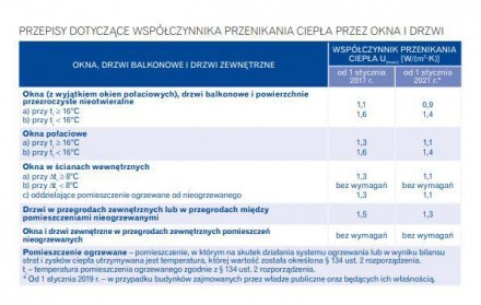 Już od kilku lat przepisy Prawa budowlanego wymagają instalowania w nowo powstających budynkach okien o podwyższonych parametrach izolacyjności termicznej. Wymogi te, wprowadzane w Polsce od 2014 r., wynikają z Dyrektywy Europejskiej 2010/31/UE, której celem jest podwyższenie standardu energetycznego budynków. Dyrektywa ta nakłada na poszczególne państwa, aby doprowadziły do sytuacji, w której wszystkie nowe budynki będą charakteryzować się niemal zerowym zapotrzebowaniem na energię niezbędną do ich ogrzewaniaPrzepisy te precyzują wskaźniki zapotrzebowania budynku na energię pierwotną EP, czyli jest wartość odnoszącą się do zapotrzebowania budynku na energię z nieodnawialnych źródeł, oraz współczynniki przenikania ciepła U przez przegrody zewnętrzne (ściany zewnętrzne, podłogi na gruncie, stropy, dachy oraz okna i drzwi). Do tej pory wymogi te były sukcesywnie zaostrzane, a w styczniu 2021 r. zrównają się z zaleceniami, jakie obowiązują w standardzie budynków energooszczędnych. Nowe wymagania dla okien (w skrócie określane jako WT 2021) oznaczają, że inwestor będzie musiał wyposażyć dom w ciepłe okna. Ich współczynnik przenikania ciepła nie będzie mógł on przekroczyć 0,9 W/(m2·K) w oknach pionowych i 1,1 W/(m2·K) w dachowych. Tym samym przepisy narzucają inwestorom standard stolarki okiennej zalecanej dla domów energooszczędnych.