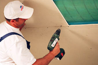 Następnie za jej pomocą przyklejamy folię do profili. Miejsca połączeń z murłatą i ścianami szczytowymi izolujemy taśmą klejąca rozprężną. Zamontowanie pokrycia z płyt gipsowo-kartonowych kończy prace przy ociepleniu poddasza (zdj.8).
