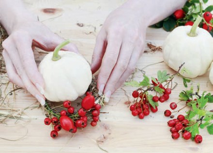 6. Wybieramy fragment, który będziemy dekorować ozdobnymi, jesiennymi owocami (najlepiej maskując miejsce łączenia) i wplatamy weń poszczególne gałązki, oplatając oraz podwiązując je nicią.