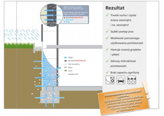 Dzięki temu nie dochodzi do kondensacji pary wodnej na powierzchni tynku, co prowadzi do powstawania nieprzyjemnego zapachu stęchlizny oraz tworzenia się grzybów pleśniowych. Dzięki zastosowaniu systemu BOTAZIT ® RENOVATION FRP tworzy się miły i zdrowy klimat wewnętrzny, a ponadto powierzchnia ścian na długi czas pozostaje w doskonałym stanie.