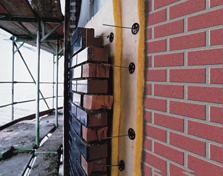 3. Płyty nakłada się na zabezpieczone antykorozyjnie pręty łączące obie warstwy muru ("metoda na jeża"), uważając, aby nie porozrywać welonu szklanego.